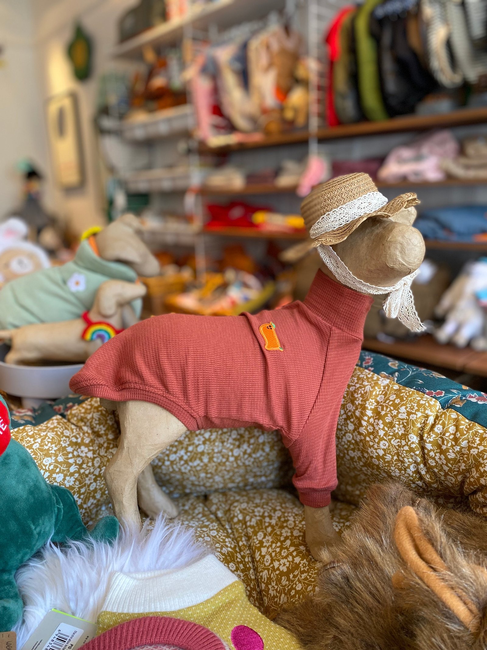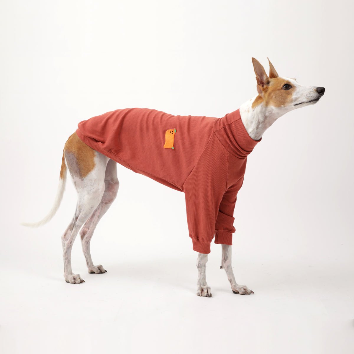 This jumper is designed to fit greyhound, lurcher, whippet figures. Made in cotton and polyester. It can be machine washed in low temperature.